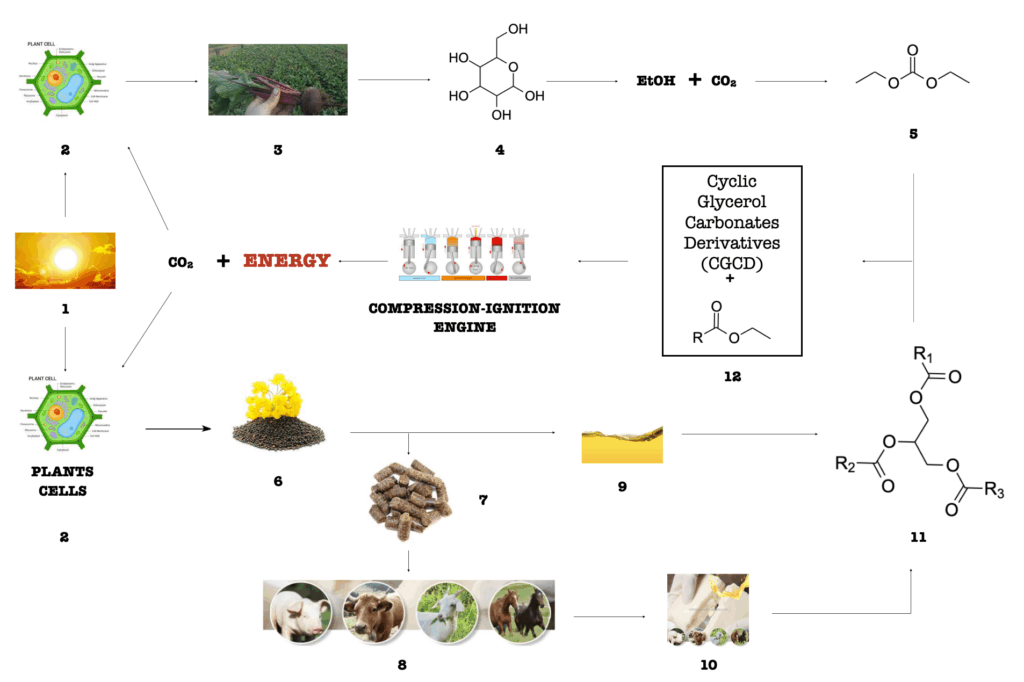 1- Sun; 2- Plant Cell; 3- Sugars; 4- Glucose; 5- Dialkyl Carbonate; 6- Oleaginous; 7- Animal Meal; 8-Meat; 9-Vegetable Oil; 10- Tallow; 11-Triglycerides; 12- Biodiesl-Like Biofuel