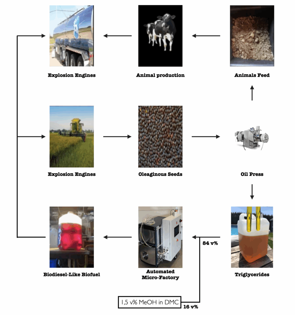 Knowing that transportation accounts for 25 % of our global carbon dioxide emissions, thus energy uses, and that triglycerides and glucoses are ubiquitous, delocalized automated on-site micro-machines, that can transform them into a biodiesel-like biofuel with this new carboneutral cycle biofuel possibility, is offering a chance to create a sustainable alternative to petrodiesel by creating small delocalized circular energy economy.